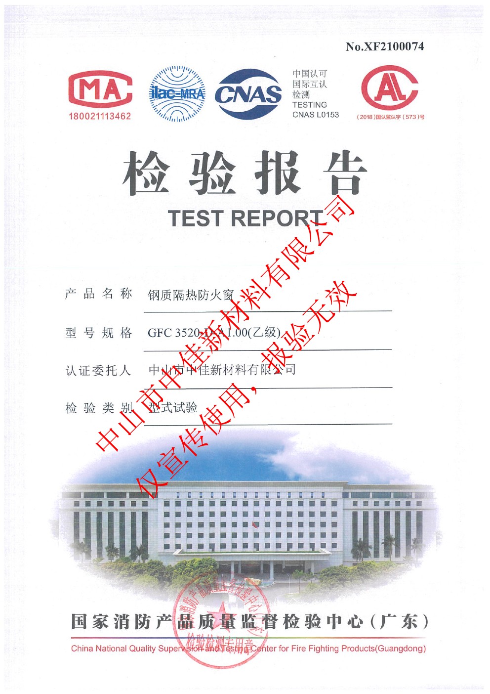 中佳防火玻璃再獲新突破,通過(guò)甲乙級(jí)固定防火窗檢測(cè)報(bào)告